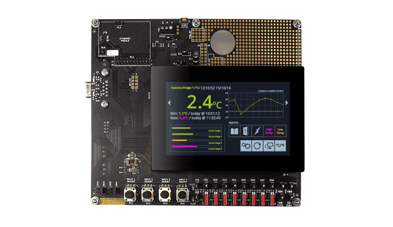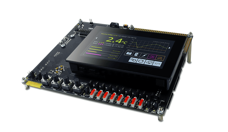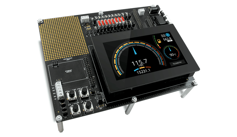 SGD 43-A DK+ is a development kit for the SGD 43-A display. The development board itself provides switches, dials, LEDs and screw terminal connections to quickly connect to and test all of the input/output functionality of the PanelPilotACE display.