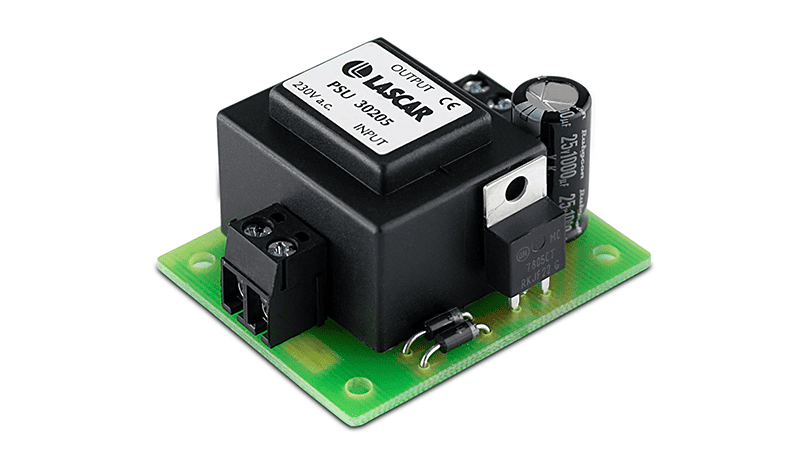 The PSU 30205 is a linear power supply with 240V a.c. input and a regulated 5V / 100mA d.c. output. The unit is low profile and features an encapsulated mains transformer and screw terminal connections. The design includes over-current and over-temperature protection. The PSU 30205 is a popular part, normally stocked in high quantity and suitable for new designs.